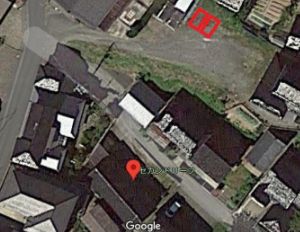 赤枠2台分が駐車場です。店舗前は道幅が狭いので乗り入れはご遠慮願います。
